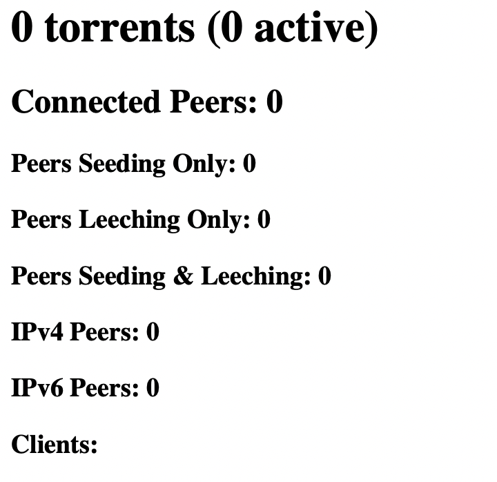 Open the stats page in your browser http://localhost:6969/stats to see stats on your bit torrent client.